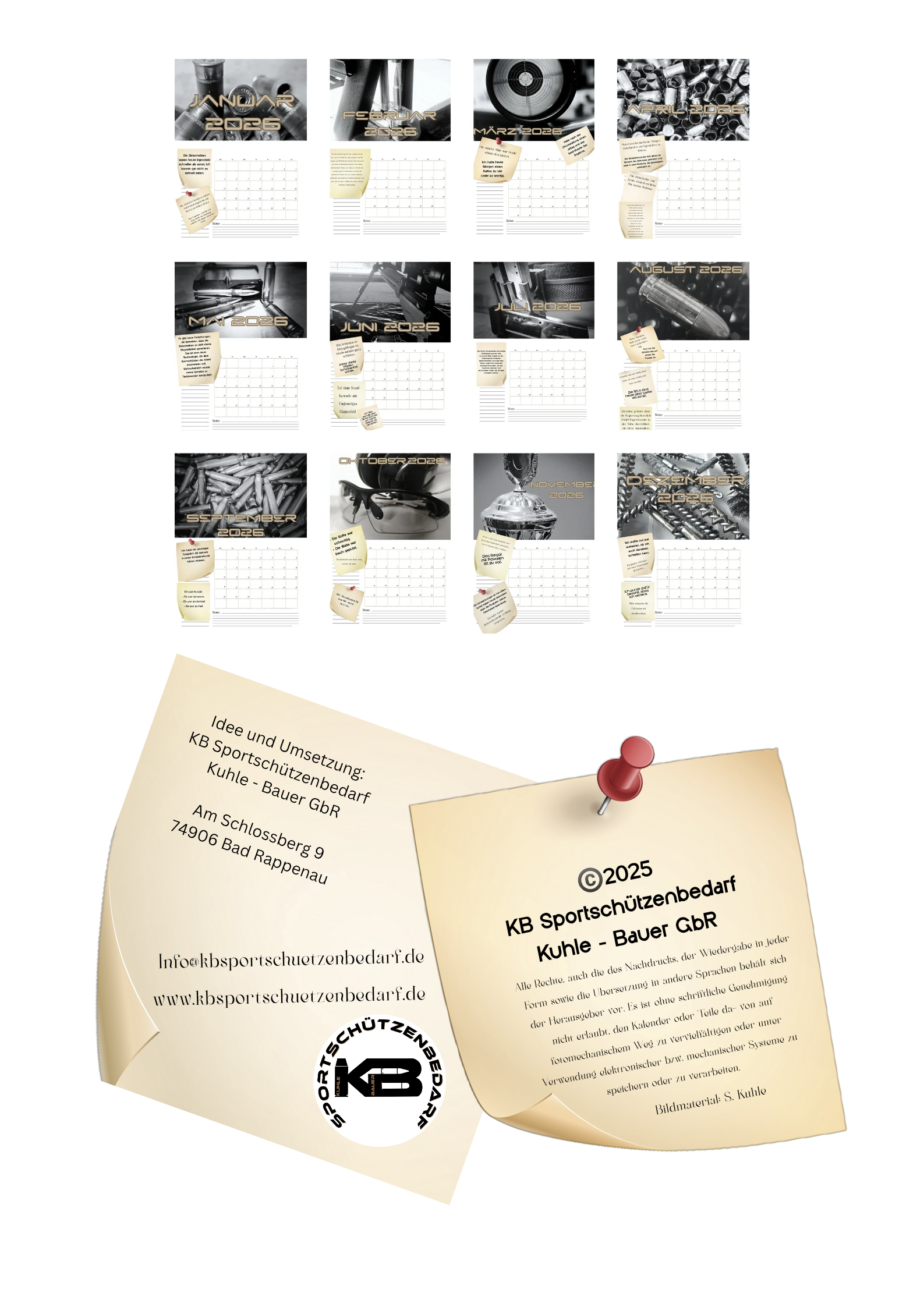 Verbessern Sie Ihr Schießtraining auf humorvolle Art und Weise mit unserem speziell für Sportschützen gestalteten 12-Monatskalender im A3-Format. Dieser einzigartige Kalender kombiniert praktische Informationen mit einem Augenzwinkern und bietet Ihnen jeden Monat eine neue, witzige Ausrede, warum der Schuss nicht saß.